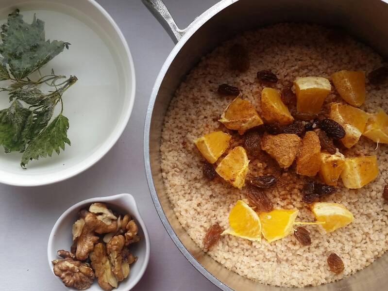 - boekweitvlokken, gekookte boekweit (wel rauw en licht geroosterd) met amandelnoten, walnoten