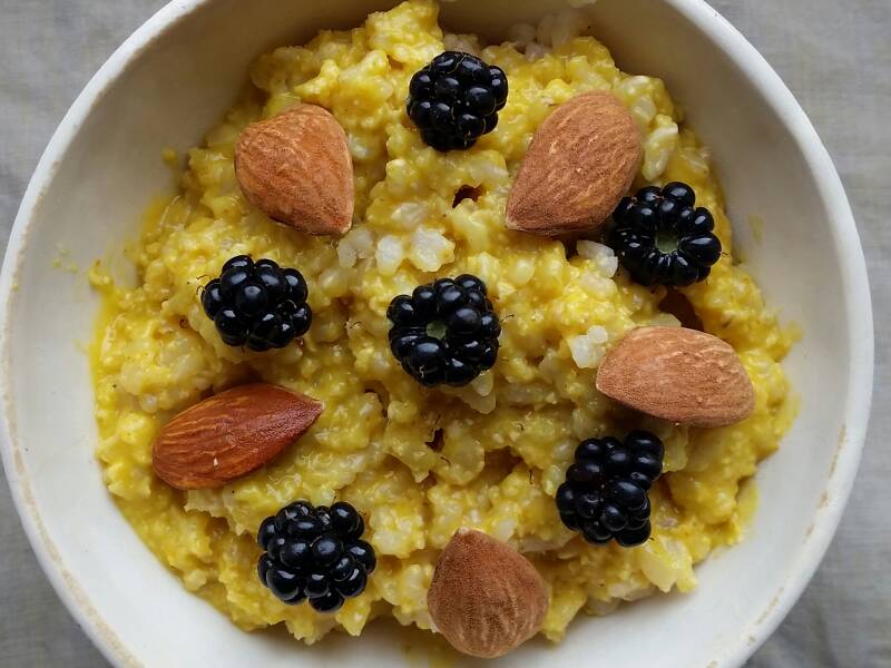 Breng water en rijstdrank hevig aan de kook onder gesloten deksel. Neem de pot van het vuur en voeg al roerend met een garde de polenta, gedroogd fruit en geelwortel toe in één beweging. (Giet ze naast de garde om klontering te voorkomen.) Blijf roeren tot de pap stevig is en schep onmiddellijk uit. In het geval van een portie voor meerdere personen: schep de polenta onmiddellijk in kommetjes. Garneer met (grof gehakte) noten en geroosterde boekweitkorrels en eet het dessert op lichaamstemperatuur
